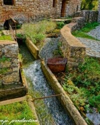 Το πρώτο κτήριο στεγάζει νεροτριβή και αλευρόμυλο με οριζόντια φτερωτή. Στο διπλανό δωματιάκι με το τζάκι, ζούσε ο μυλωνάς με την οικογένειά του. Ακριβώς απέναντι, διώροφο κτήριο στέγαζε την κατοικία του βυρσοδέψη (πάνω) και το βυρσοδεψείο (κάτω). Το εσωτερικό του εργαστηρίου είναι χωρισμένο σε ζώνες που αντιστοιχούν στα διάφορα στάδια επεξεργασίας των δερμάτων. Το λιθόστρωτο οδηγεί σε πλάτωμα, όπου διαμορφώνεται φυσική δεξαμενή, και καταλήγει στον μπαρουτόμυλο.
