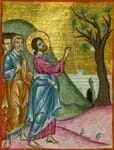 Παράλληλα, στη λειτουργία της Μεγάλης Δευτέρας περιλαμβάνεται και η ιστορία της άκαρπης συκιάς που την καταράστηκε ο Χριστός και ξεράθηκε. Ο Χριστός περπατώντας στους δρόμους της Ιερουσαλήμ, την επομένη ημέρα της εισόδου του, είδε μια μεγάλη συκιά με καταπράσινο φύλλωμα και την πλησίασε με σκοπό να κόψει ένα σύκο,όμως διαπίστωσε ότι η συκιά όμως δεν είχε καθόλου καρπούς. Τότε ο Ιησούς απευθυνόμενος στο δέντρο είπε : “Μηκέτι εκ σου καρπός γένηται εις τον αιώνα και εξηράνθη παραχρήμα η συκή” και η συκιά την ίδια στιγμή ξεράθηκε και γι’ αυτό λέγεται καταραμένη συκιά ή ξηρανθείσα συκιά. Η ιστορία της άκαρπης συκιάς συμβολίζει την Συναγωγή των Εβραίων της εποχής και την ζωή του Ισραηλιτικού λαού που ήταν φαινομενικά ενάρετοι, αλλά πρακτικά άκαρποι από καλά έργα.