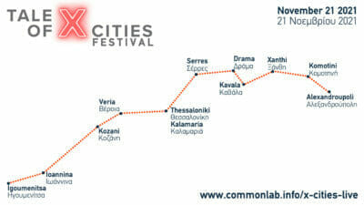 Η ζωντανή αναμετάδοση του φεστιβάλ θα πραγματοποιηθεί την Κυριακή 21 Νοεμβρίου 2021, 12:00-17:30 στον σύνδεσμο https://www.commonlab.info/x-cities-live.html.