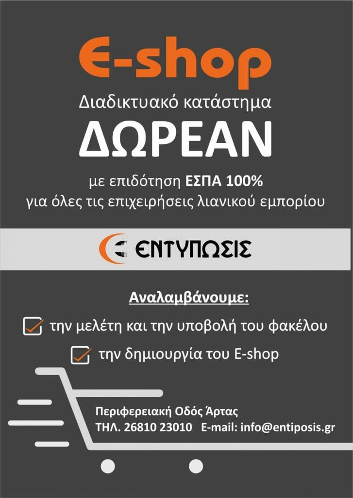 Ξεκινά στις 9 Ιουλίου 2021 η υποβολή αιτήσεων για τον Β΄ κύκλο της δράσης του ΕΠΑνΕΚ «e-λιανικό». Η εταιρεία μας αναλαμβάνει τη μελέτη, την υποβολή του φακέλου καθώς και την κατασκευή του e-shop σας !!!  www.entiposis.gr